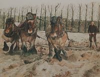 Zeeuwse trekpaarden voor de eg bij het keren op de akker.