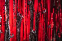Wensboom Sekinchan in Maleisië vol met rode linten waarop wensen staan. Deze worden in de boom gegooid.