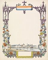 Wensbrief met onbeschreven cartouche binnen een decoratief kader met een gezicht op Delft.