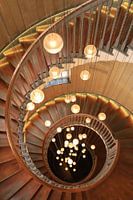 Deze prachtige wenteltrap is te vinden in een meubelzaak in het centrum van Londen. De mooie, klassieke trap wordt nog extra mooi door de lichtgevende ballen van de kroonluchter die erboven hangt.