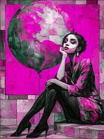 Stel je een rustige wachtruimte in een treinstation voor waarin een wereldbol schittert. Daaronder zit een elegant silhouet - niet zomaar iemand, maar de belichaming van onze eigen reislust. Hier smelten felroze en bewolkt groen samen tot een levendig mozaïek dat elke stap in de verte belooft. De foto vertelt geen biografie, maar een universeel moment: de wereld wacht en toch genieten we van de zoete pauze die eraan voorafgaat, wanneer dromen groter zijn dan welk tijdschema dan ook.