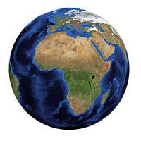 Wereldbol met Afrika uitgelicht als hoofdrolspeler. Ook Europa en het Midden-Oosten is zichtbaar op de kaart.