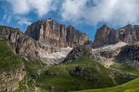 Een kabelbaan gaat in de zomer met toeristen omhoog naar de top van het Sella massief in de Dolomieten in Zuid-Tirol, Italië.