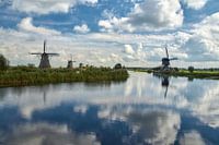 Unesco Werelderfgoed Kinderdijk. De blauwe lucht en de wolken weerspiegelen mooi in het water.