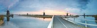 Een overzicht van Werelderfgoed Kinderdijk (Zuid-Holland, Nederland). Deze panorama bestaat ui 16 foto's en geeft een overzicht van de Kinderdijkse molens tijdens de zonsopkomst. De loopbrug zorgt voor de diepte evenals de twee watergangen! Een schitterend moment in een schitterend gebied!