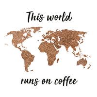 'Wereldkaart Koffiebonen met de quote 'This world runs on coffee'.