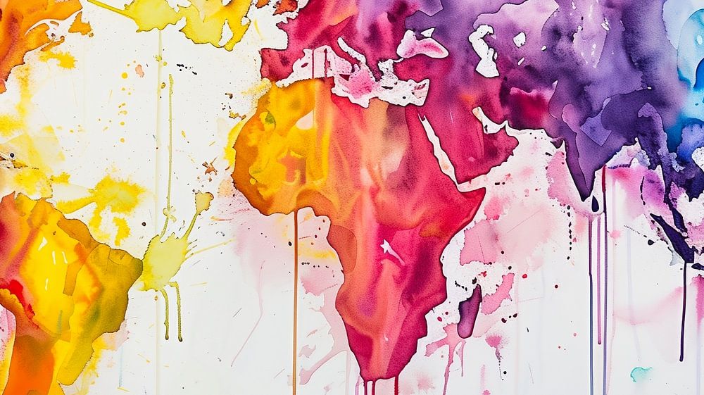 Een creatieve en kleurrijke weergave van de wereldkaart, ontworpen met aquarelachtige kleurverlopen in de kleuren van de regenboog. Druppels en strepen van kleur stromen naar beneden en geven de afbeelding een dynamisch en levendig effect. De harmonieuze combinatie van geografie en artistieke expressie symboliseert diversiteit, eenheid en de schoonheid van onze planeet.