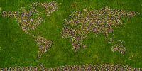 Voor wie het hele jaar de lente aan de muur wil hebben: een wereldkaart van gele, witte en paarse krokussen in een groen grasveld.