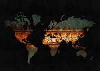 Roestige wereldkaart uitgesneden op een donker grijze / zwarte achtergrond. Roest in de kleuren groen, turquoise, rood, oranje en creme.