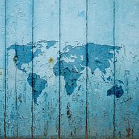 "Wereldkaart op blauw verweerd hout" is een Wereldkaart dat door middel van een digitale bewerking op een fotobeeld van een oude blauwe verweerde schuurdeur is geplaatst.
