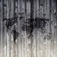 De wereldkaart wordt getoond in een transparante donkergrijze kleur, zodat de houtnerven zichtbaar zijn.