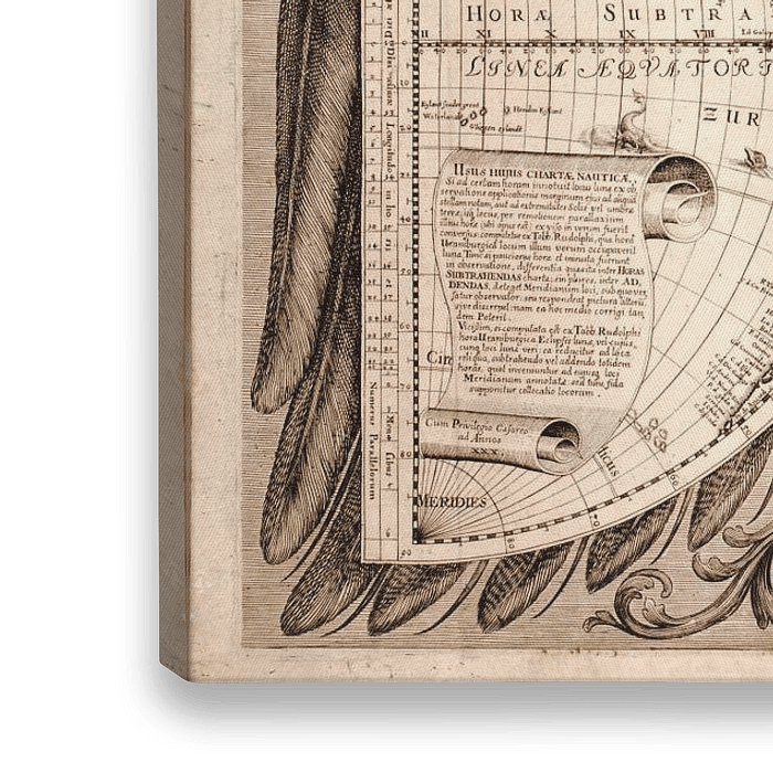 "Nova Orbis Terrarum Delineatio Singulari Ratione Accommodata Meridiano Tabb. Rudolphi Astronomicarum.", antieke wereldkaart uit 1630, gemaakt door Philippus Eckebrecht.
