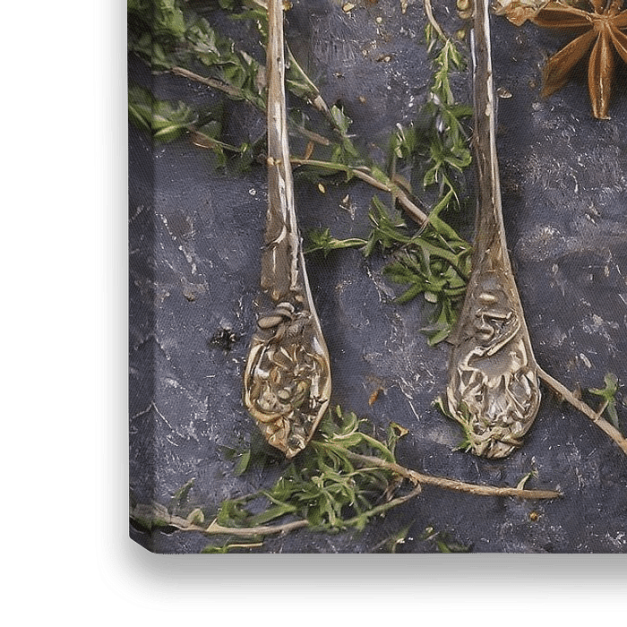 Een bonte mix van allerlei kruiden en specerijen. Allemaal hun eigen krachtige karakter en kleur. Samengesteld tot een pakkende foto waar de kleuren vanaf spatten, rechtstreeks jouw keuken in. De combinatie van de aardse kleuren en de koperen lepels geeft het geheel een nostalgische look. Ik hou van koken en gebruik echt weleens kruiden en specerijen. Maar bij het ontwikkelen van dit kunstwerk heb ik kruiden leren kennen waarvan ik nog nooit had gehoord. Naast het bekende zout, de peper en bijvoorbeeld paprika poeder vind je in dit kunstwerk zeldzamere kruiden uit zowel de Aziatische keuken als bijvoorbeeld de oosterse en Latijnse keuken. Hoeveel kruiden en specerijen kun jij benoemen?