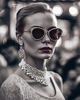 Het subtiele lichtrode accent op Amanda's lippen zorgt voor een prachtig contrast met de monochrome achtergrond, waardoor haar innemende glimlach en charmante expressie extra opvallen. Haar diamanten sieraden, waaronder fonkelende oorbellen en een schitterende halsketting, stralen pure luxe en verfijning uit en versterken haar aristocratische verschijning.