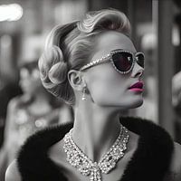 Het subtiele lichtrode accent op Jane's lippen zorgt voor een prachtig contrast met de monochrome achtergrond, waardoor haar innemende glimlach en charmante expressie extra opvallen. Haar diamanten sieraden, waaronder fonkelende oorbellen en een schitterende halsketting, stralen pure luxe en verfijning uit en versterken haar aristocratische verschijning.