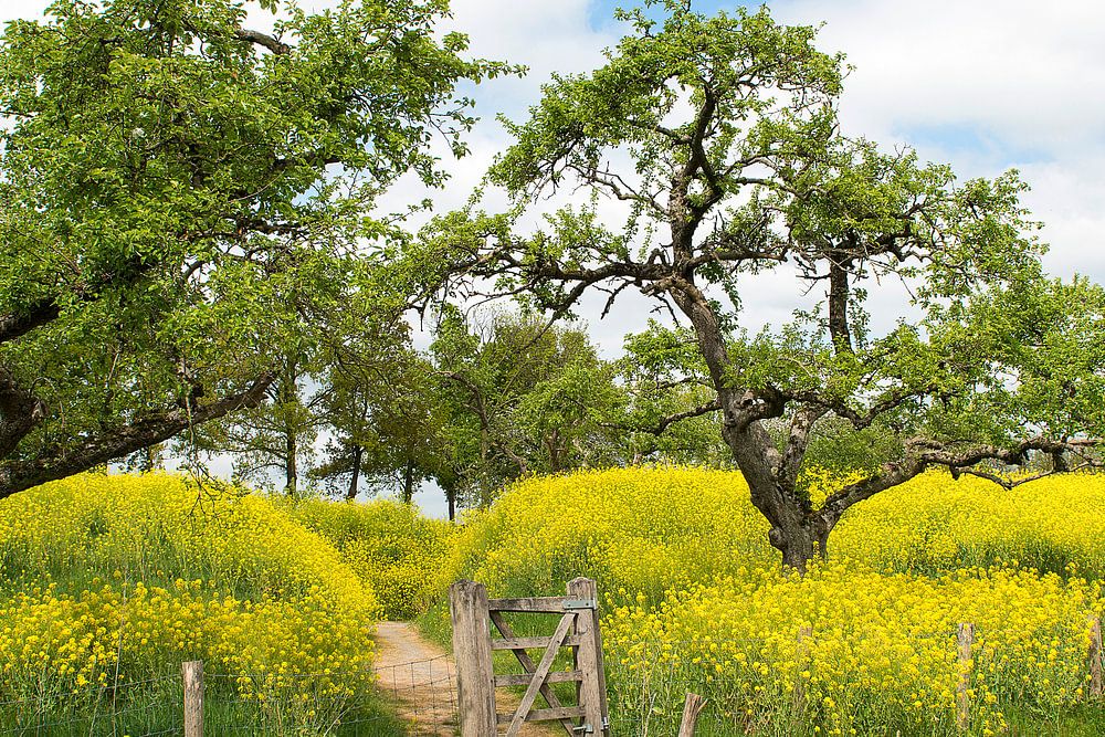 Bloeiend koolzaad en bomen bij de verdedigingswerken Werk aan de Groeneweg, een klein werk van de Nieuwe Hollandse Waterlinie