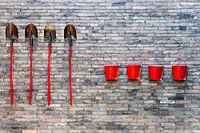 Rode brandemmers en spades hangen aan de muur.