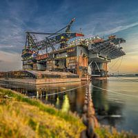 Het werkeiland Thialf van de firma Heerema, aangemeerd in het Calandkanaal bij Rozenburg.