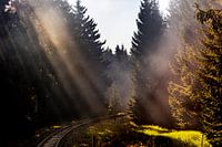 Stoomtrein verbinding door de bergen. Het licht schijnt schitterend door de bomen.