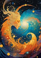 In een wervelende kosmos van goud en blauw verschijnt een sereen gezicht, met gesloten ogen alsof ze het universum in haar bestaan droomt. Sterren, planeten en golven van licht dansen om haar heen en weven een tapijt van schepping. Ze zweeft tijdloos, een beschermgeest van eindeloze verwondering en hemelse schoonheid.