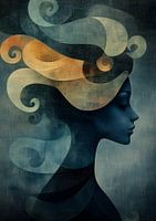 elegantie en mysterie in een surrealistisch portret. Het silhouet van een vrouw, uitgevoerd in diepe blauwtinten, wordt omgeven door golvende, abstracte vormen in warme gouden en koele blauwgroene tinten. Deze vloeiende vormen, die doen denken aan rook of wervelende wind, stralen beweging en energie uit, terwijl ze tegelijkertijd een…