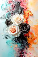 Dit schilderij is een symfonie van kleuren en vormen die het oog door een wirwar van emoties leidt. Drie rozen - een in glinsterend wit, een in zacht oranje en de derde in diep zwart - staan opgesteld als de hoofdrolspelers in een levendige dans van kleuren en energieën. Ze komen tevoorschijn uit een werveling van kleuren die variëren…