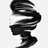 Dynamisch portret, uitgevoerd in een krachtig zwart-wit contrast. De afbeelding toont een zijprofiel van een persoon, wiens gelaatstrekken en haar lijken te transformeren in vloeiende, wervelende penseelstreken die beweging en verandering suggereren. Deze stijl kan interpretaties van innerlijke strijd, groei of de complexiteit van de…
