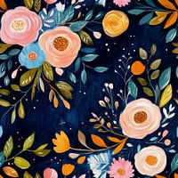 De donkerblauwe acrylachtergrond van dit bloemenkunstwerk vormt een opvallend contrast met de handgeschilderde bloemen en takken in een naïeve stijl die de compositie omlijsten. De bloemen in zachte blos- en warme tinten zijn abstract en charmant eenvoudig, en stralen een gevoel van onschuld en eigenzinnigheid uit. De fijne…