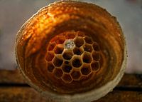 Wespennest in nachtlampje - een onafgemaakt wespennest dat open is zodat de kern zichtbaar is. Het is bevestigd aan een oud bijenkorfframe. In het midden is iets wat lijkt op een enkele gevulde cel. Om de een of andere reden hebben de wespen dit nest verlaten.