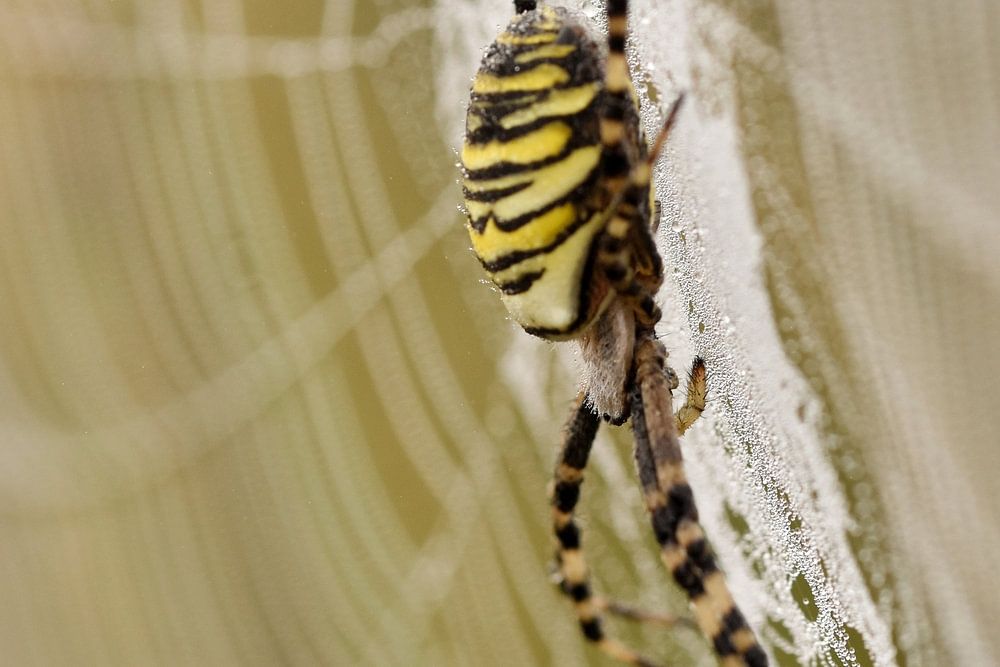 's Ochtends vroeg op het heideveld van het Mantingerveld. De wespspinnen zaten nog volop in de heide. De mistige start van de ochtend zorgde voor prachtige dauwdruppels.
