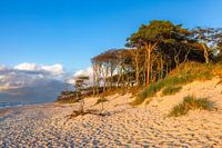 Het Darß-weststrand met het aangrenzende Darß-bos en zijn windbanken in het gouden licht van de ondergaande zon.