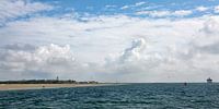 Vanaf de boot "de Talisman" een panoramafoto van West Terschelling. Rechts is de veerboot "de Friesland" te zien.