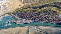 West-Terschelling met haven, vuurtoren Brandaris en stuk Groene Strand van boven. Ms. Friesland van rederij Doeksen meert net af na de overtocht uit Harlingen.