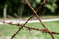 Westerbork Drenthe The Netherlands Camp (Kamp, Durchgangslager) Westerbork. Transit camp used to send Dutch onwards to concentration camps. Rusty barbed wire surrounding the camp.