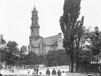 Een oude zwart-wit foto van de Westerkerk in Amsterdam gemaakt door Breitner. Foto is gemaakt eind 19de eeuw. Mannen op de voorgrond dragen de stijl uit de tijd en er loopt ook een grote hond.
