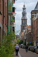 Vanuit de Bloemstraat in het hartje van de Jordaan heeft men een prachtig zicht op de Westerkerk met haar machtige Westertoren die boven alles uit steekt. Dit werk is in een aantal beeldvarianten als wel in kleur of zwartwit te verkrijgen.