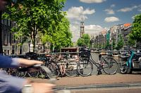 De beroemde Westertoren in Amsterdam, Vanuit allerlei plekken te bewonderen. Ik koos voor deze foto de Berensluis vlakbij het Johnny Jordaanplein. In Amsterdam is het altijd druk met fietsers, vooral in de zomer. Dat heb ik geprobeerd terug te laten komen in deze foto.