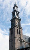 Amsterdam The Netherlands The iconic Westertoren at Westerkerk on the Prinsengracht reappears from behind scaffolding after a long period of renovations. Stitched vertical panorama.jordaan.