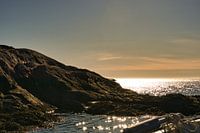 Westkaap in Noorwegen. Fjord en zee met zonsondergang en bergen aan de kust. Geen wolken, blauwe lucht. Ruige natuur in Scandinavië