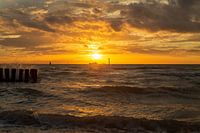 Langzaam zakte de zon weg in zee op het einde van de dag aan de kust van Westkapelle, Zeeland, Nederland. Mooie oranje en gele tinten werden zichtbaar in de lucht, watergolven spatte tegen de golfbreker en in de horizon kwam een boot voorbij varen, mooie sfeervolle afsluiting van een mooie zonnige dag.