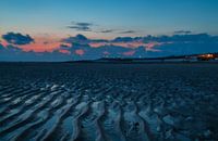 Deze opname heb ik gemaakt na zonsondergang op het strand van Westkapelle, Zeeland, Nederland. Na zonsondergang waren prachtige kleuren zichtbaar in de lucht tijdens blue hour en werden de structuren in het natte zand mooi belicht. Op de achtergrond is strandbar Bombaai verlicht te zien, het geheel leverde een sfeervolle foto op.