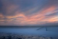 Zonsondergang in Westkapelle aan de golfbreker. Op een winderige zomeravond, een golfbreker aan de Noordzee bij Westkapelle. Foto gemaakt met lange sluitertijd voor heerlijk dromerig effect op het water en in de wolken formatie.