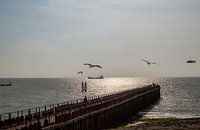 Aanlegsteiger bij het KNRM station van Westkapelle, Zeeland, Nederland. Het was laat op de middag en langzaam zakte de zon. Ik heb de aanlegsteiger tegen het licht in gefotografeerd en dat gaf een mooi beeld. Op de horizon komt een vrachtschip voorbij varen en de vliegende meeuwen op de voorgrond maken de foto compleet.