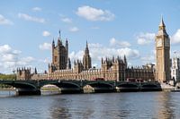 London England United Kingdom. Houses of Parliament on the River Thames on a sunny day with blue skies and puffy clouds. Westminster.