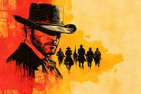 De illustratie in de stijl van een western van Sergio Leone vangt de ruige schoonheid van het Wilde Westen. Op de voorgrond staat een eenzame revolverheld gekleed in een versleten maar stijlvolle cowboypak. Zijn ogen bevinden zich in de schaduw van zijn hoed terwijl hij met een doordringende blik in de verte kijkt.