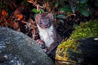 Een wezel die vanachter steen te voorschijn komt in de Allier, Frankrijk.