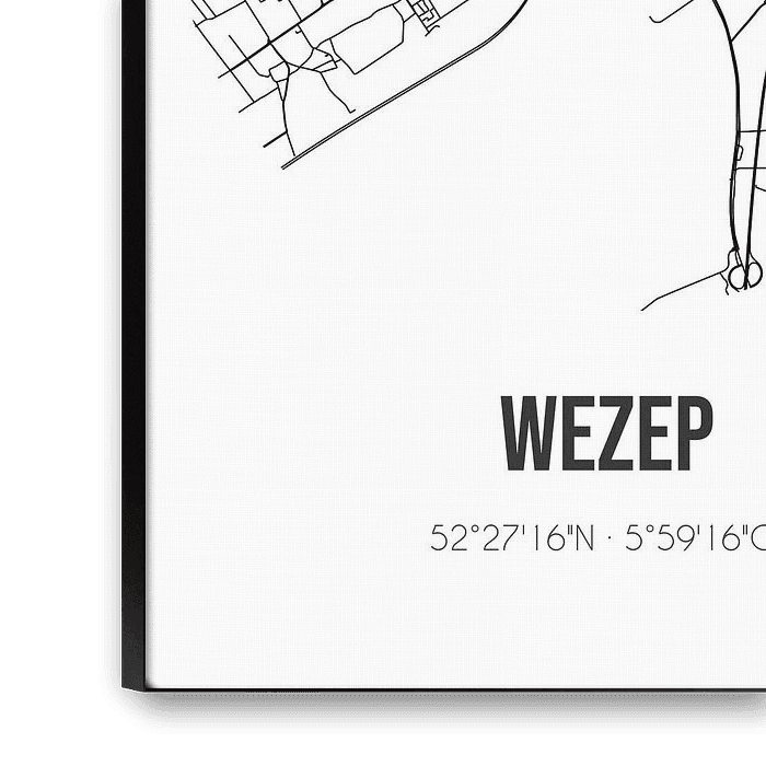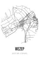 Zwart-witte landkaart, stratenplan of plattegrond van Wezep. Wezep is gelegen op de Veluwe, in de gemeente Oldebroek, provincie Gelderland. Op de stadskaart zijn alle openbare wegen in Wezep opgenomen. Verder is de kaart voorzien van de coördinaten van het centrum van Wezep.