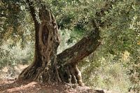 Oude olijfboom in Andalusisch landschap. Mooi en gehavend door het vele snoeien van de boom.