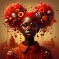 Portret van een Afrikaans meisje / vrouw met rood haar en een grote bril, dit kleurrijke portret heeft bloemen in vele kleuren, geel, rood, blauw, roze, paars. Het maakt het een vrolijk en kleurrijk geheel, doordat de bloemen overal zijn, maakt het het geheel wat surrealistisch, maar zeker bijzonder om naar te kijken