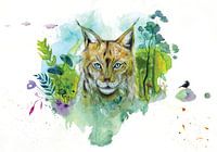 Uit de stilte van het woud verschijnt het hoofd van een lynx — scherp, wild en vol mysterie. Zijn blik snijdt door het landschap, terwijl het bos rondom hem ademt van leven. Paddenstoelen groeien als verborgen gedachten aan de voet van oude bomen, vogels dwarrelen als fluisteringen door de takken. Met aquarel, Ecoline, potlood en andere gemengde media ontstaat een dromerige wereld — een samenspel van kleur, textuur en intuïtie. Dit werk toont niet alleen de lynx, maar vangt de ziel van de natuur zelf: waakzaam, ongetemd, en wonderlijk levend.